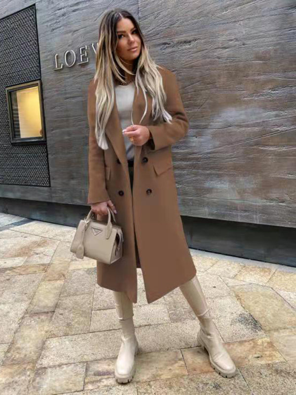 Frau trägt einen eleganten langen Wintermantel, perfekt für einen klassischen und raffinierten Look an kalten Tagen. Der Mantel hat einen stilvollen Schnitt mit doppelter Knopfleiste, kombiniert mit einer modischen Handtasche und hohen Stiefeln für ein komplettes Winteroutfit. Ideal für sowohl formelle als auch legere Anlässe, bei denen Komfort und Klasse zusammenkommen.