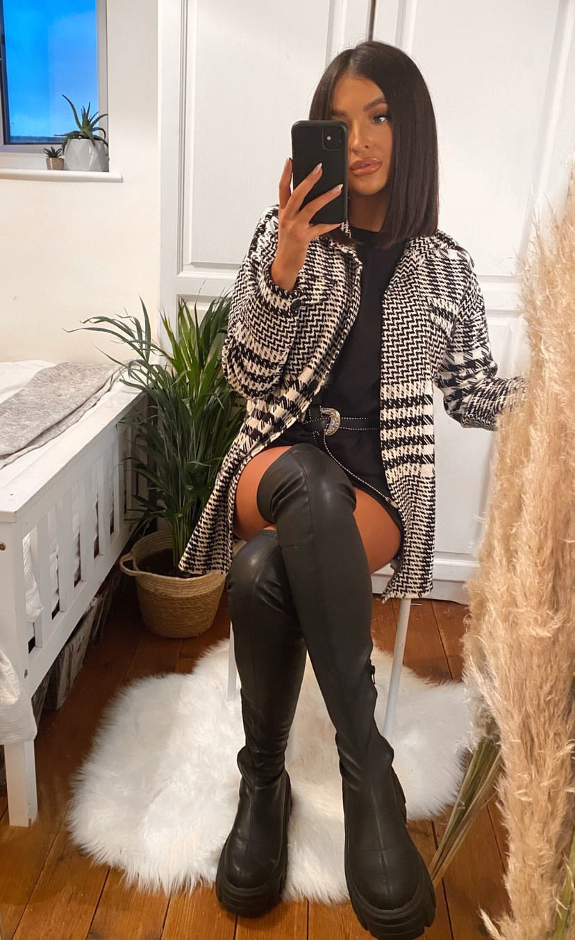 Erleben Sie modernen Stil und zeitlosen Komfort mit Sophias Oversized Kariertem Damenmantel. Diese trendige Jacke kombiniert das klassische Karomuster in kontrastierendem Schwarz-Weiß mit einer bequemen, lockeren Passform, die ideal ist für kühle Tage. Ob Sie nun durch die Stadt spazieren oder einen entspannten Look für den Alltag suchen – diese Jacke ist die perfekte Mischung aus Funktionalität und modischem Flair.